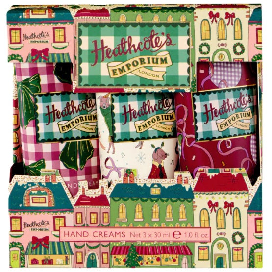 Welcome to Heathcote’s Emporium inspired by Christmas shopping with this perfect gift of three travel-sized hand creams in assorted hand painted designs.