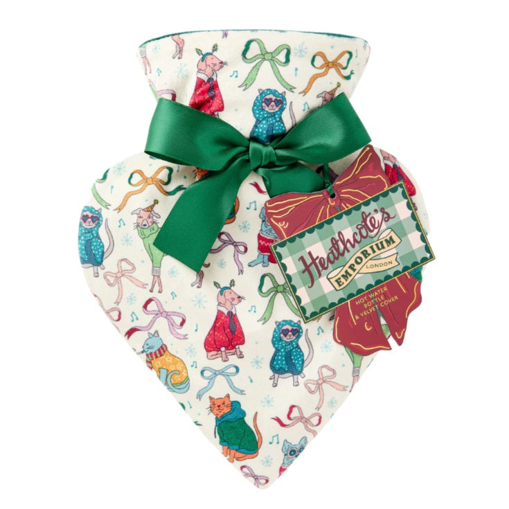 A heart shaped hot water bottle in a velvet cover to keep you warm and toasty. Just like the cats and dogs in snug jumpers and scarves in the heart-warming hottie’s design.