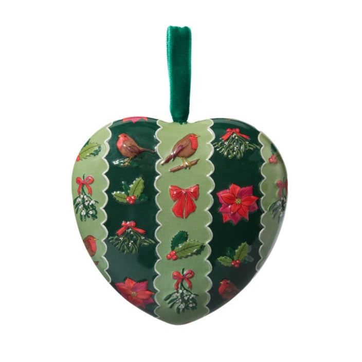 Welcome to Heathcote’s Emporium! The tin is decorated with scalloped ribbons festooned with jolly robins, red bows and mistletoe on the front and character-filled dogs and cats wrapped in snug jumpers and scarves on the back. Here is an enchanting stocking filler gift or bauble to hang from the tree with the emerald-green velvet ribbon.