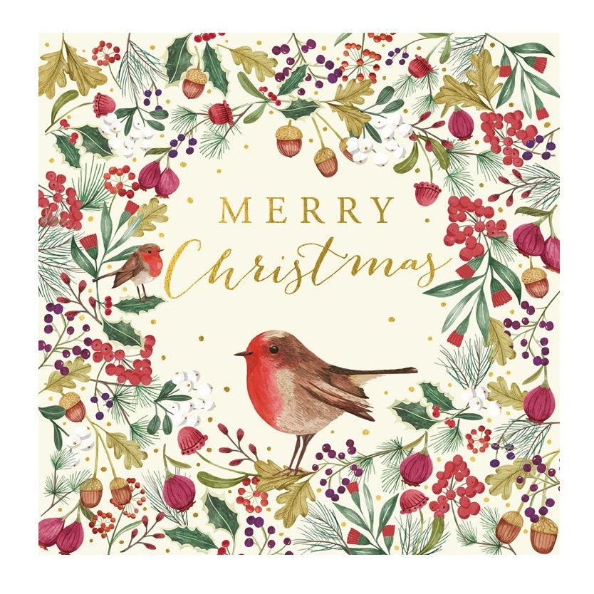 Celebrate Christmas with this beautiful pack of 6 festive cards, with 50p of each sale being donated to Young Lives vs Cancer. This card features a robin perched amongst festive botanicals and reads 'Merry Christmas'.
