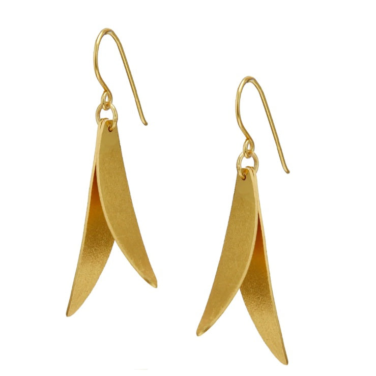 Add a touch of modern elegance to your look with a pair of unique gold dangly earrings. Each earring features two gently curved silhouettes with a satin finish that catches the light beautifully