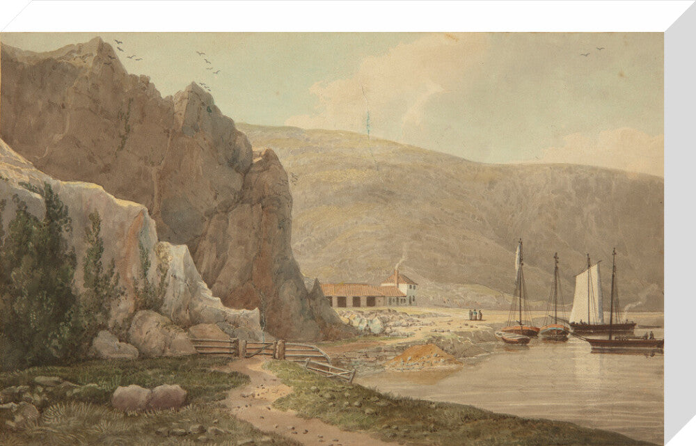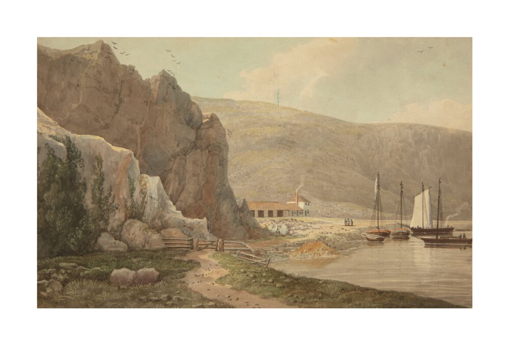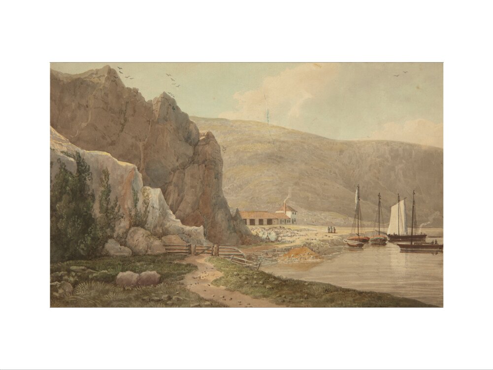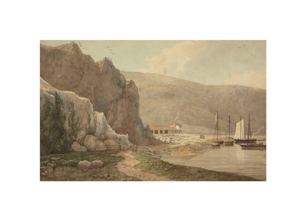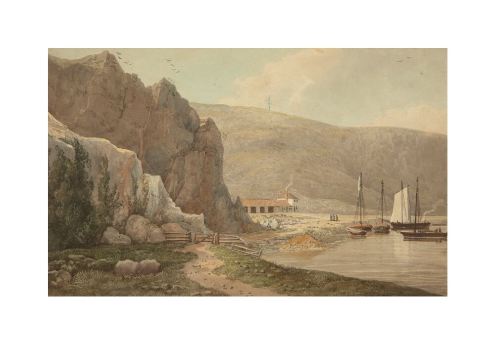 A landscape painting in blues, violets and greys. A steep rocky face dominates the left hand side of the image, with still waters of the river on the right hand side. In the background on the right there is a small settlement.