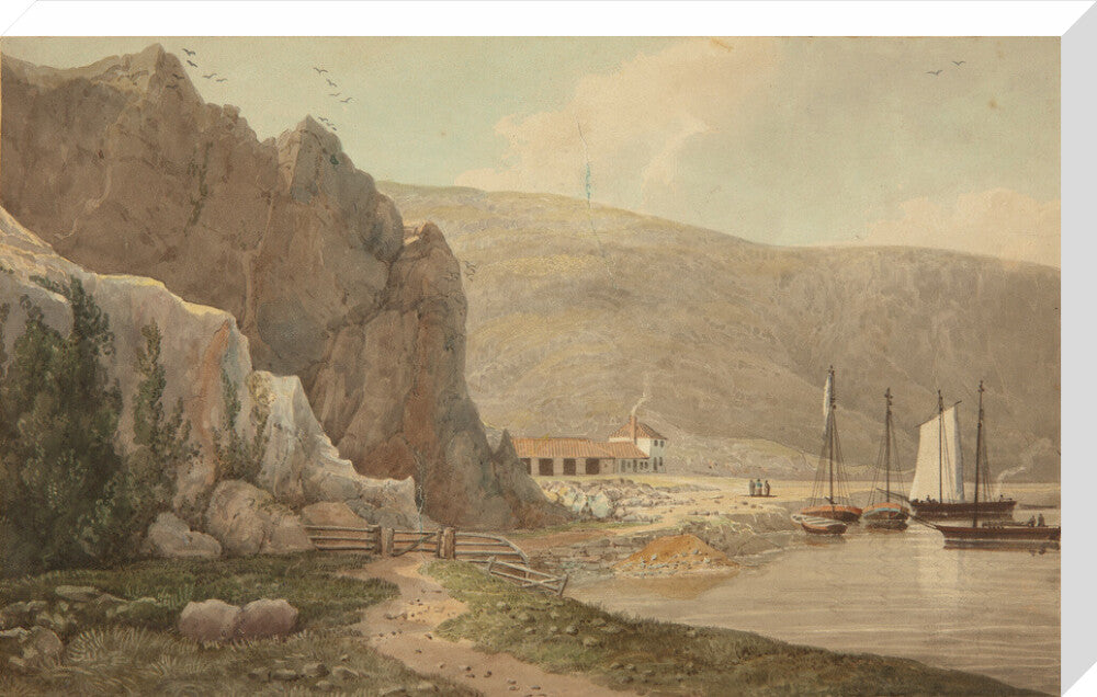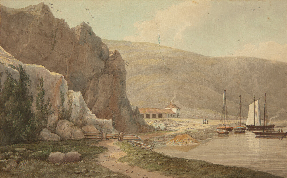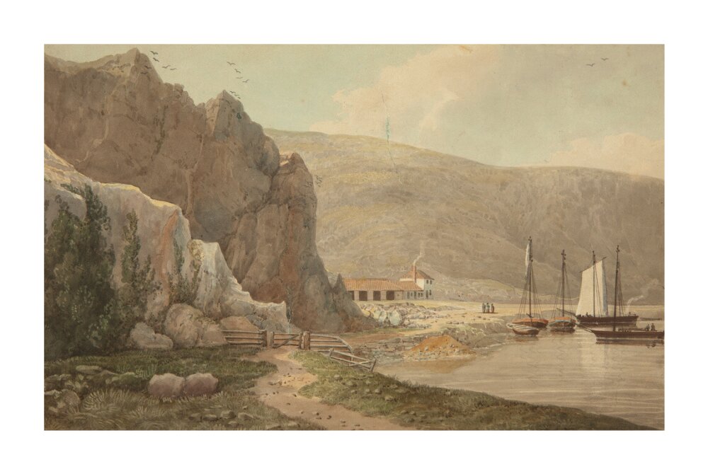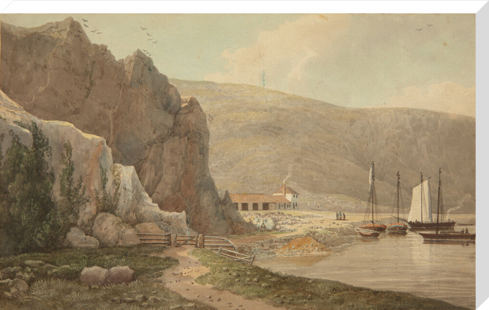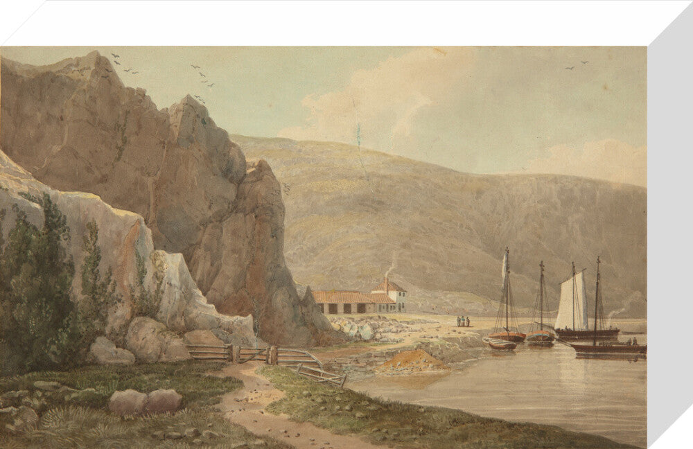 A landscape painting in blues, violets and greys. A steep rocky face dominates the left hand side of the image, with still waters of the river on the right hand side. In the background on the right there is a small settlement.