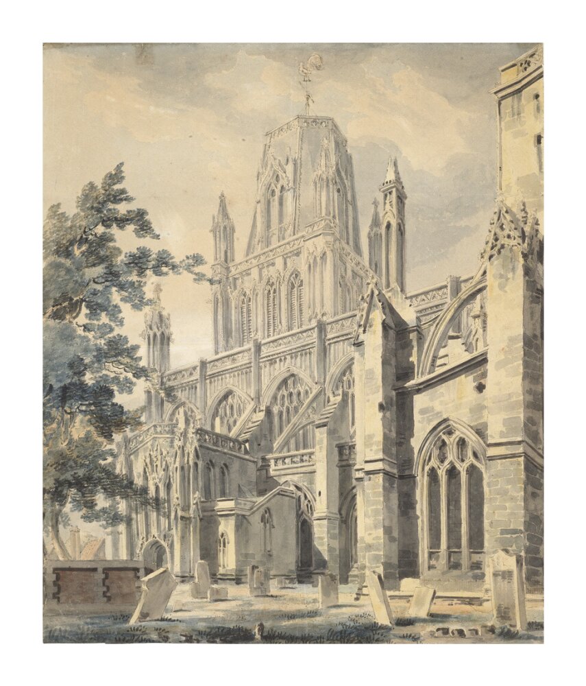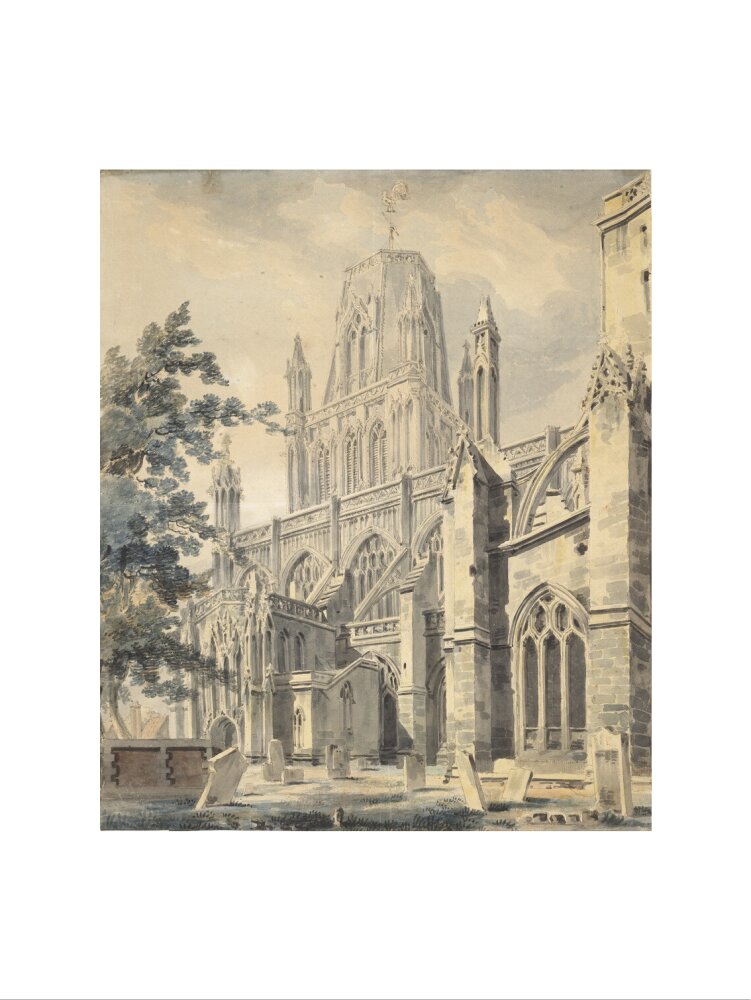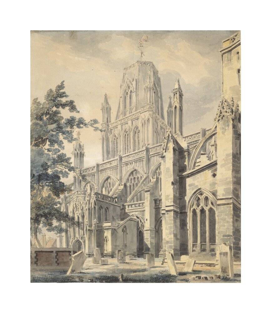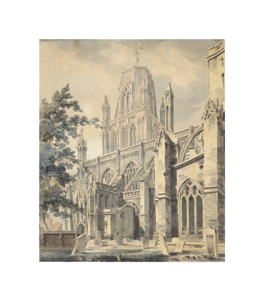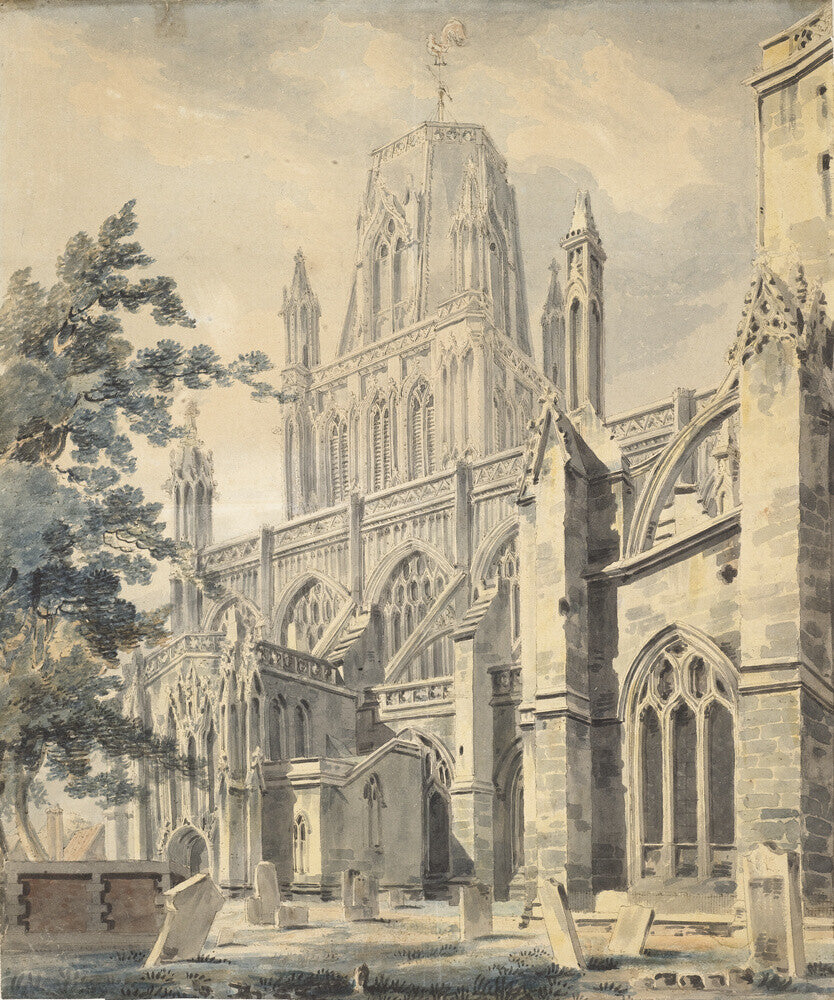 A view of the gothic church of St Mary Redcliffe, Bristol, without its spire; the low view point, upright format and reduced colour range may have been influenced by the architectural drawings of Thomas Malton; Turner was about 16 years of age when he made this work, and had recently taken lessons from Malton, as well as the formal teaching he received at the Royal Academy Schools from 1789; this work was once in the possession of a Miss Dart, a niece of the Bristol-based Narraway family, whom Turner stayed with whilst in Bristol.