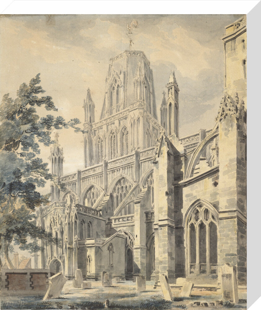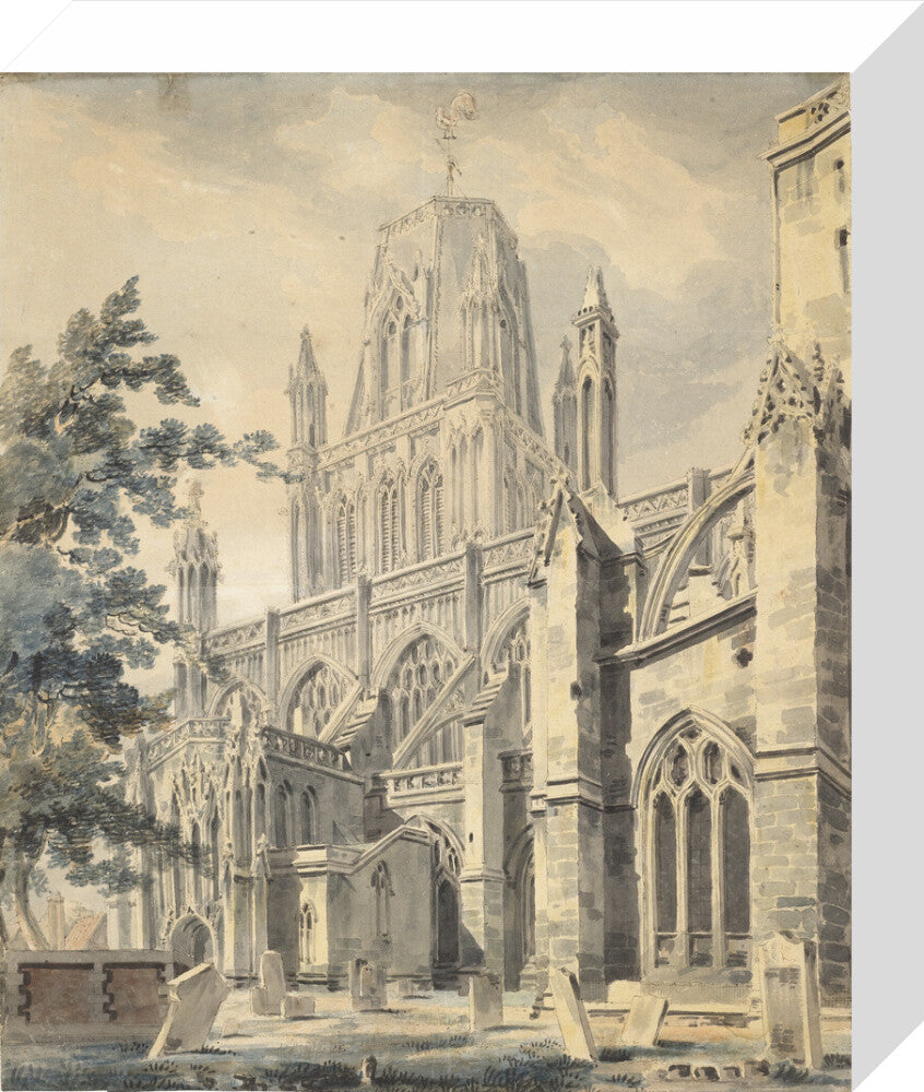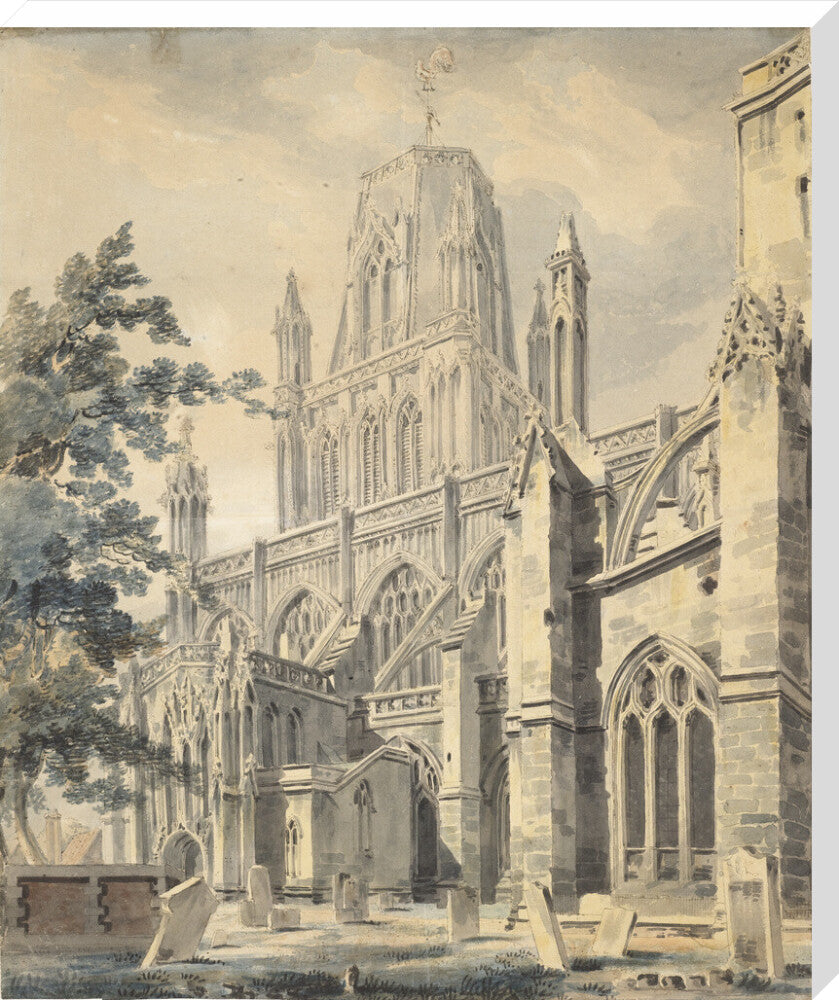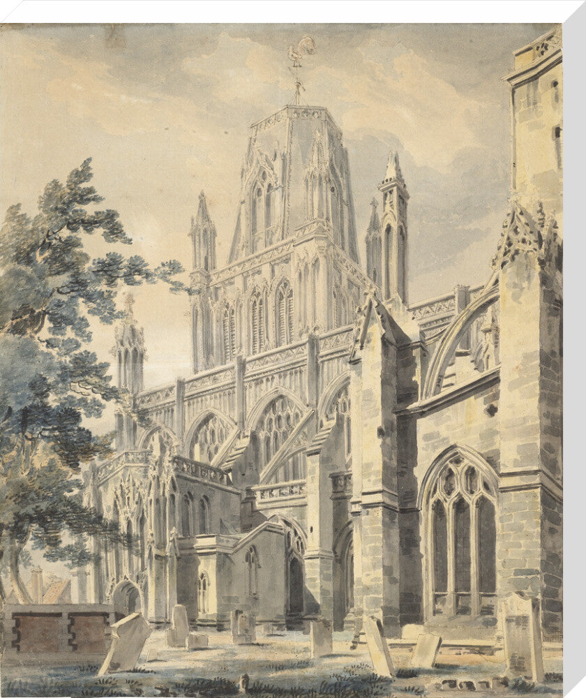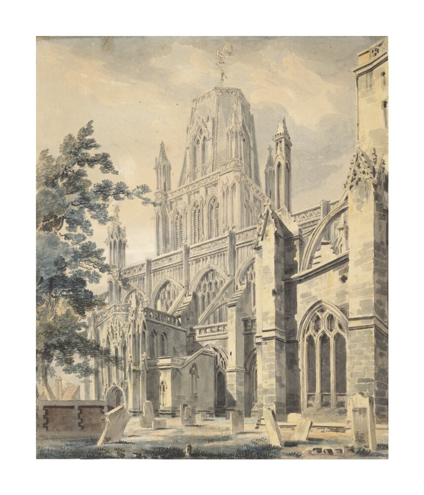 A view of the gothic church of St Mary Redcliffe, Bristol, without its spire; the low view point, upright format and reduced colour range may have been influenced by the architectural drawings of Thomas Malton; Turner was about 16 years of age when he made this work, and had recently taken lessons from Malton, as well as the formal teaching he received at the Royal Academy Schools from 1789; this work was once in the possession of a Miss Dart, a niece of the Bristol-based Narraway family, whom Turner stayed with whilst in Bristol.