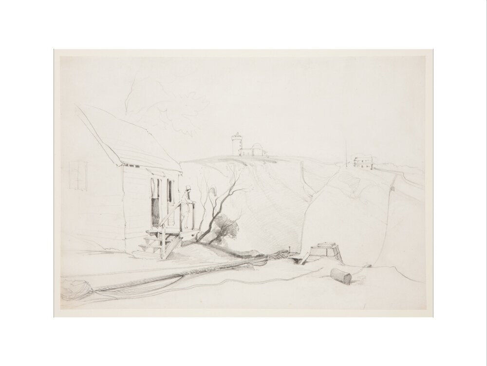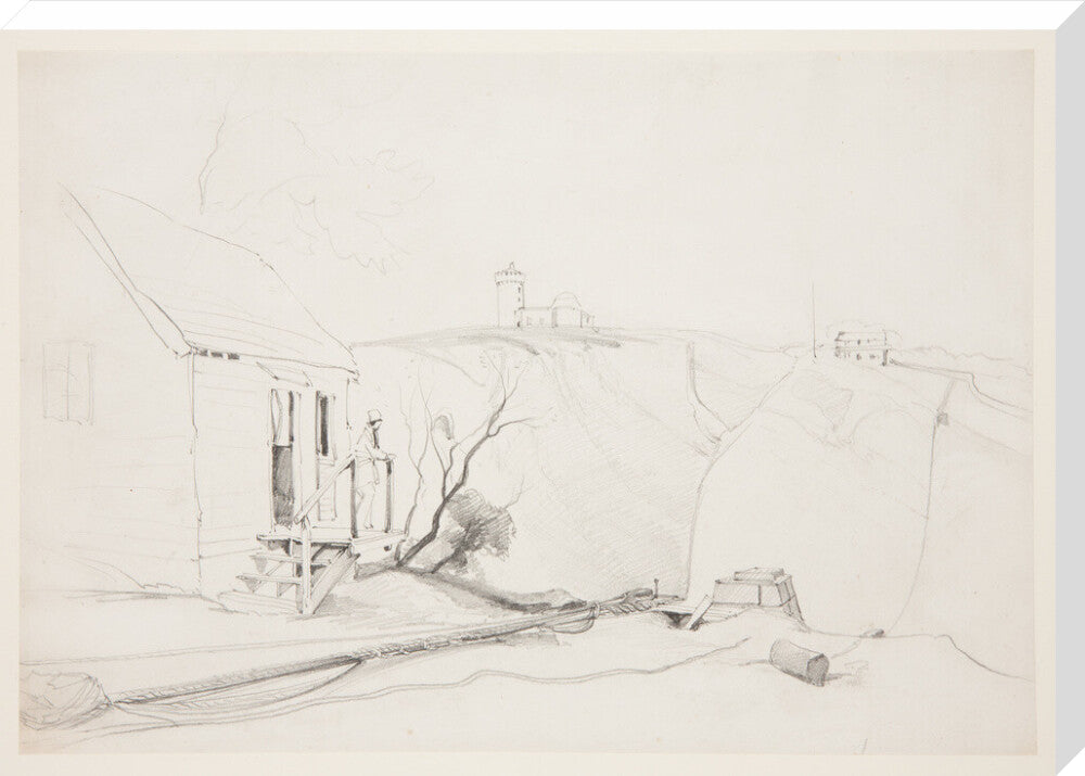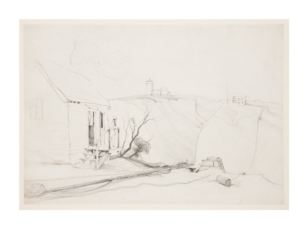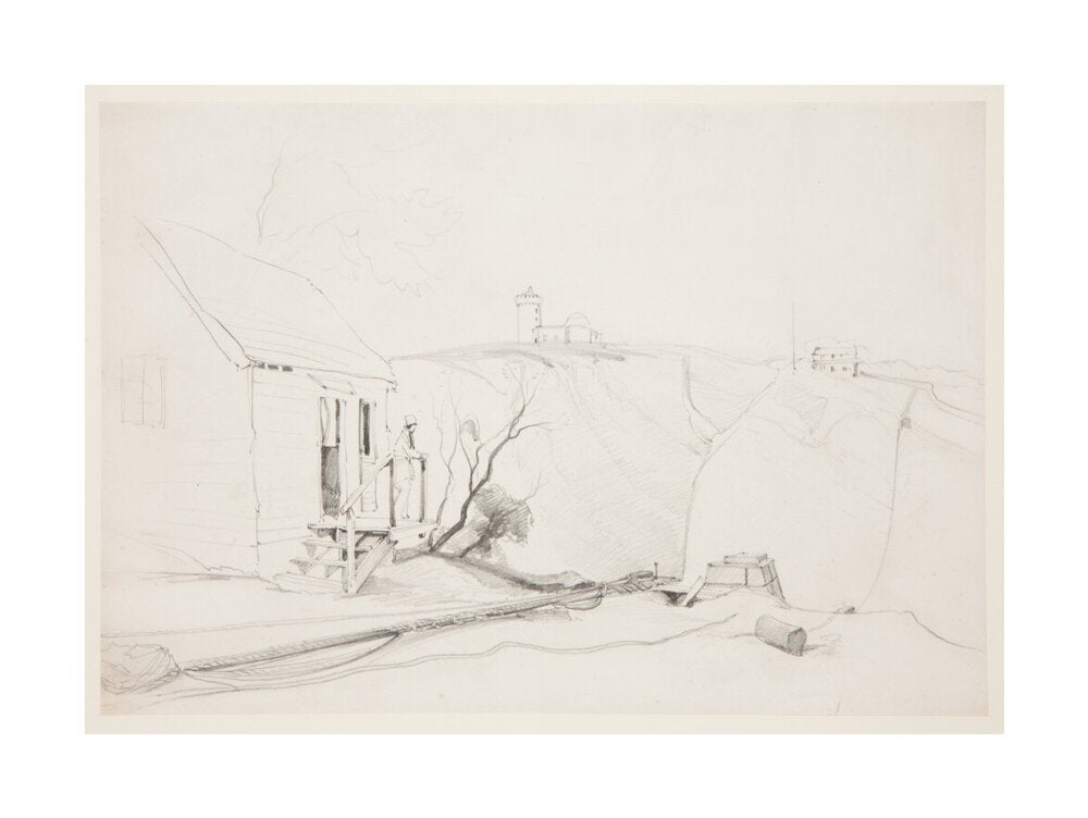 A black and white sketch of a landscape, with a high hill or cliff in the background. In the foreground, on the left is a wooden cabin, with a man looking out from the veranda.