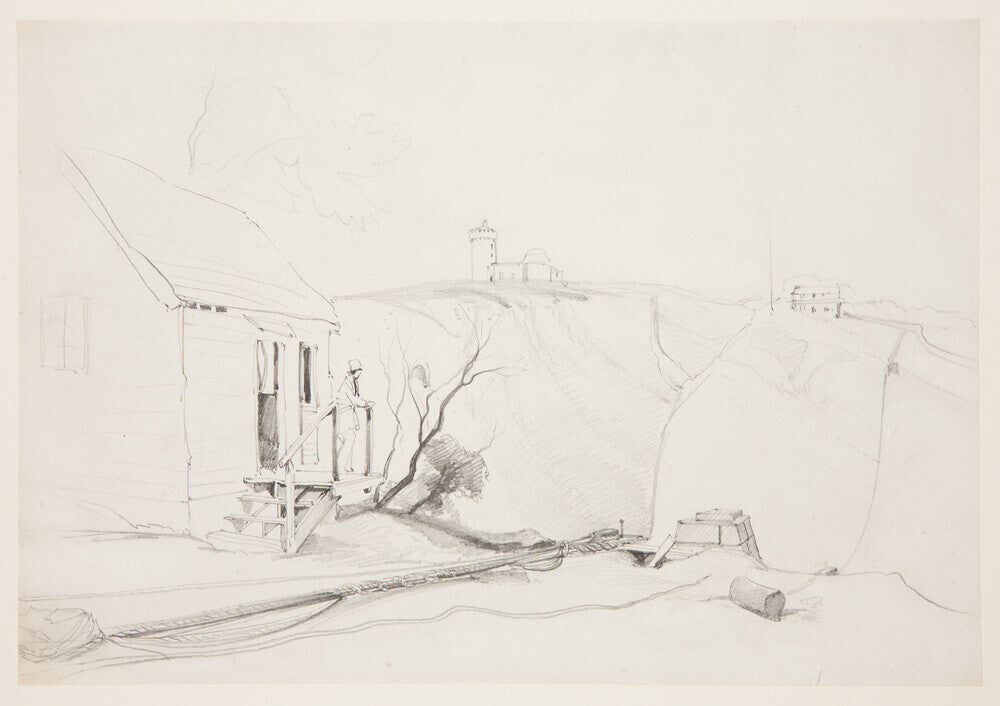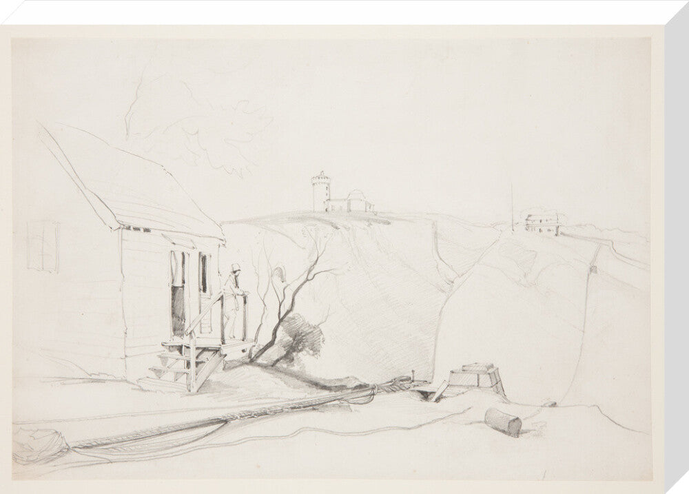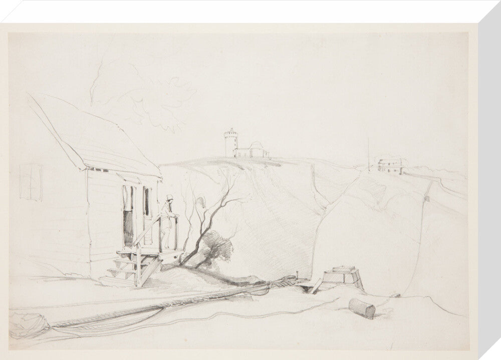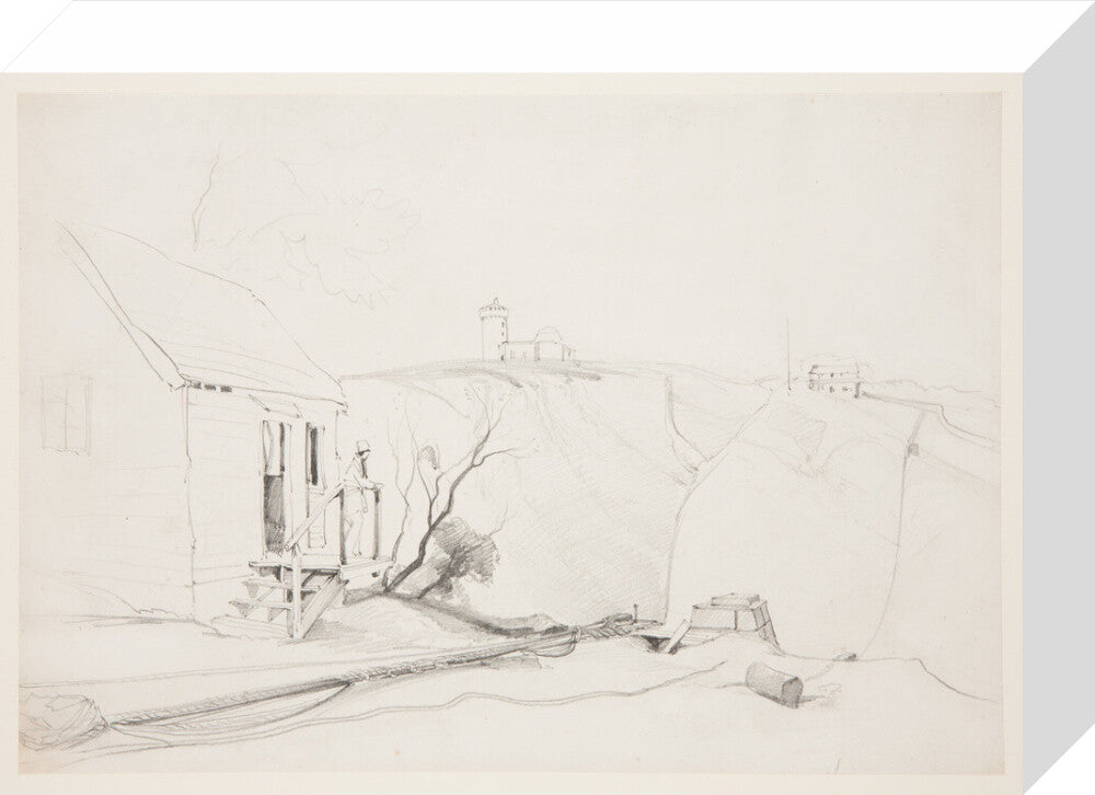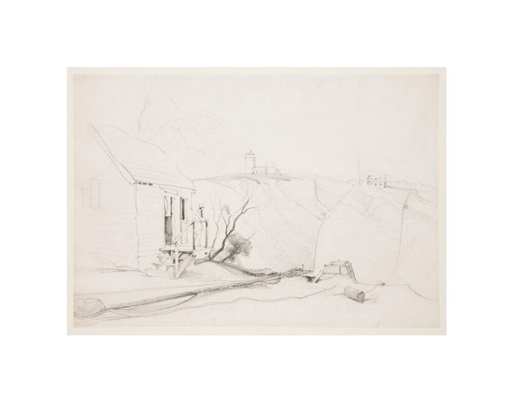 A black and white sketch of a landscape, with a high hill or cliff in the background. In the foreground, on the left is a wooden cabin, with a man looking out from the veranda.