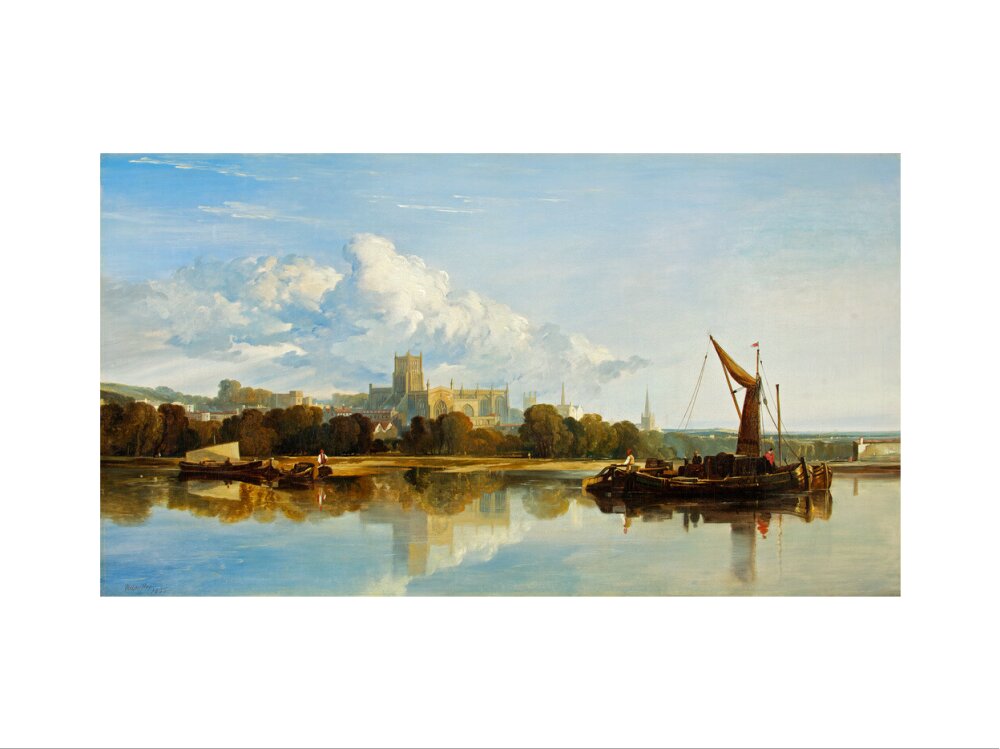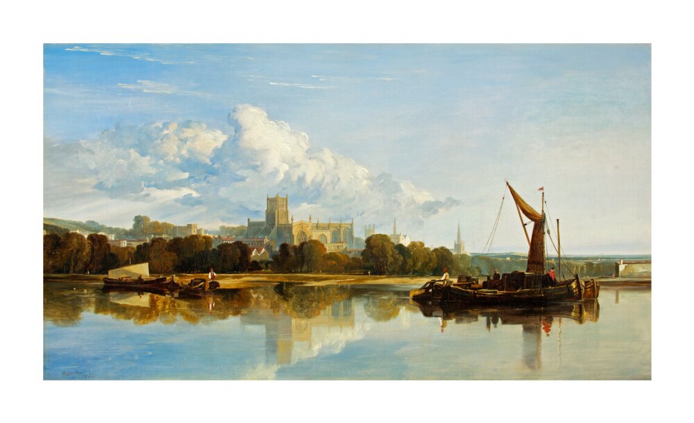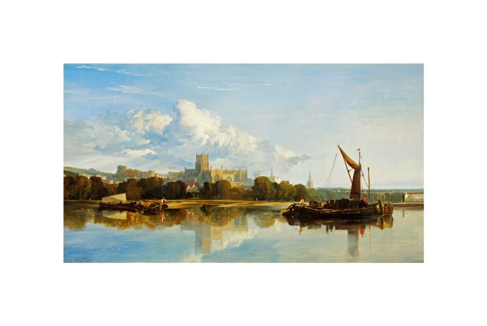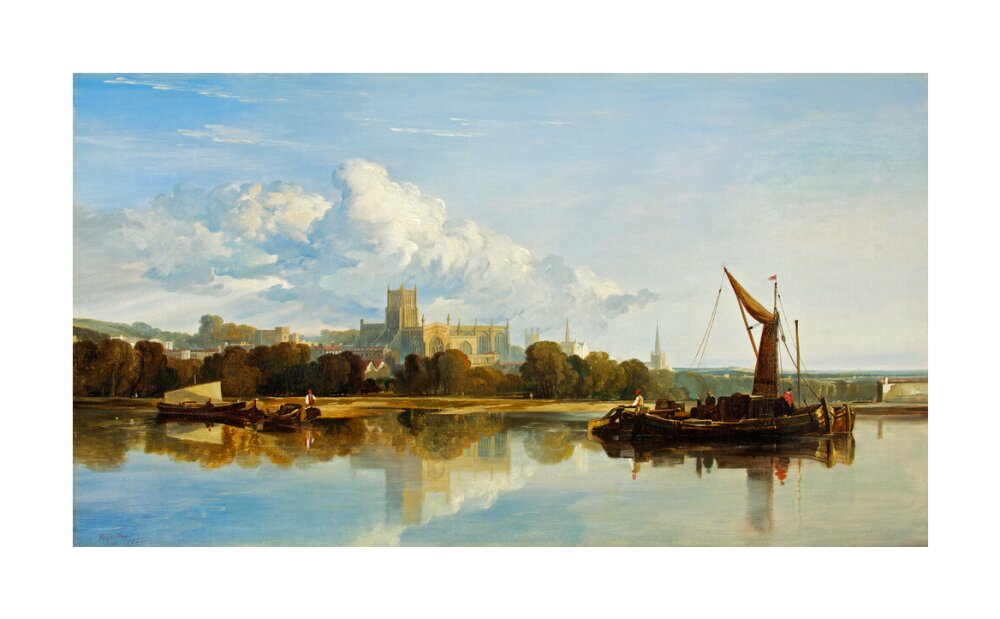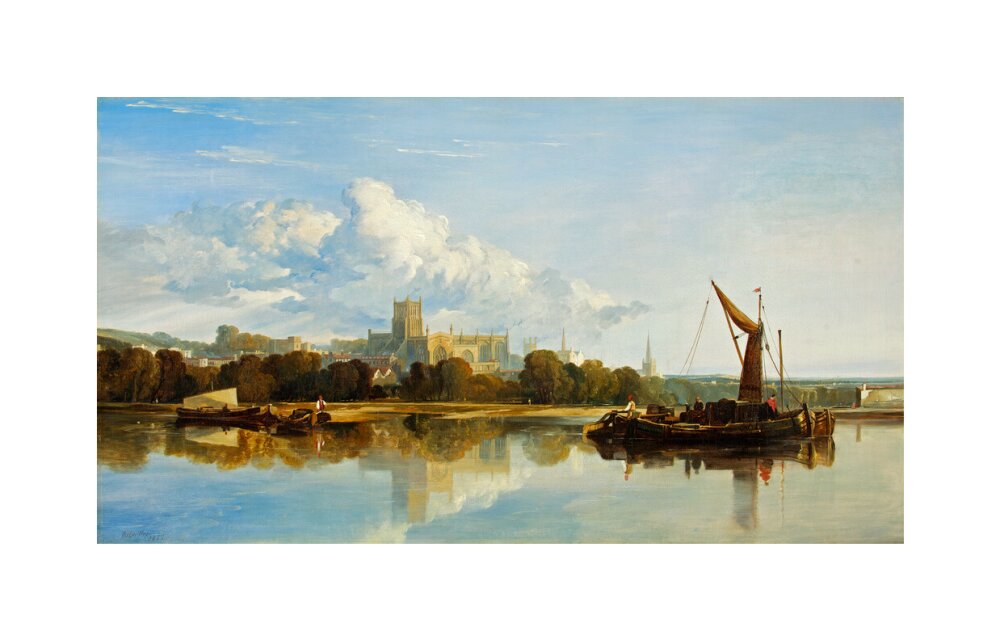 A landscape in rich colours showing Bristol cathedral in the midst of a thicket of woodland. Clouds scud across the sky and are reflected in the clear river. On the river in the foreground is a wooden cargo boat.