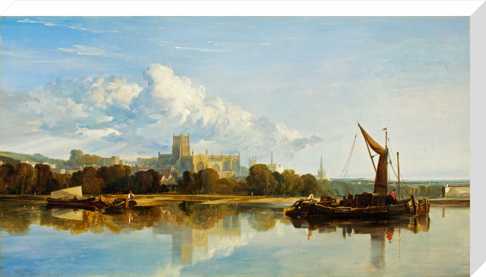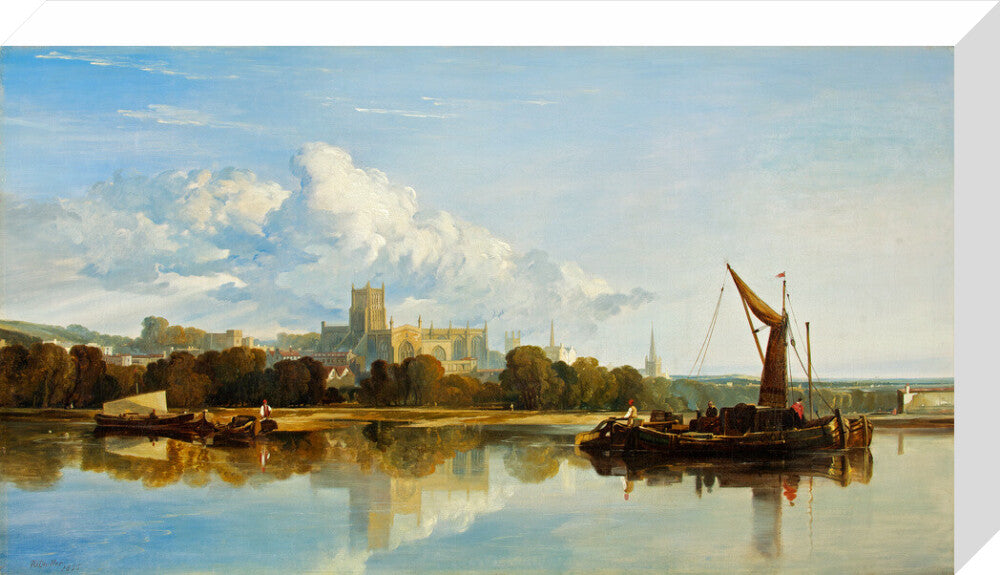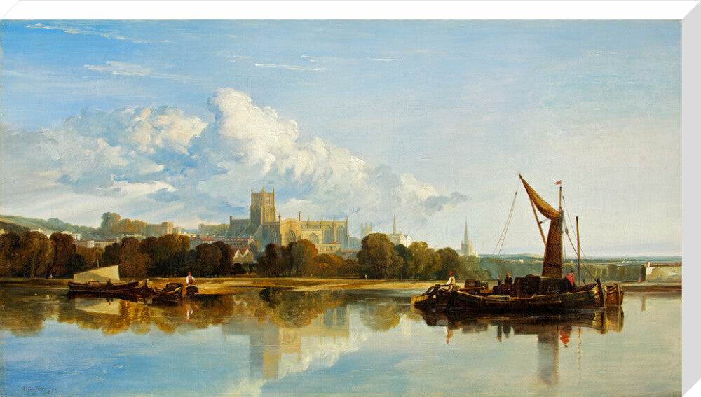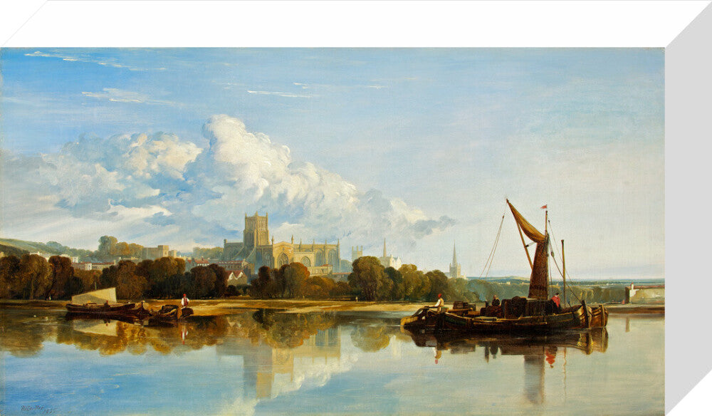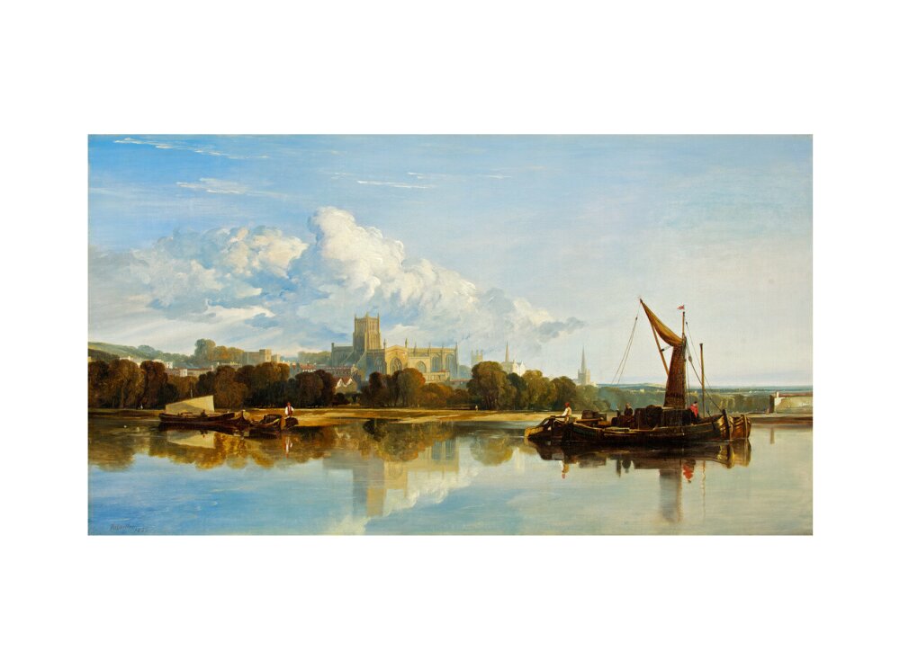 A landscape in rich colours showing Bristol cathedral in the midst of a thicket of woodland. Clouds scud across the sky and are reflected in the clear river. On the river in the foreground is a wooden cargo boat.