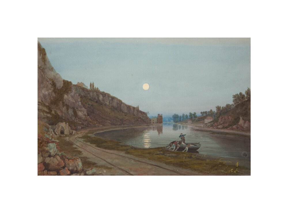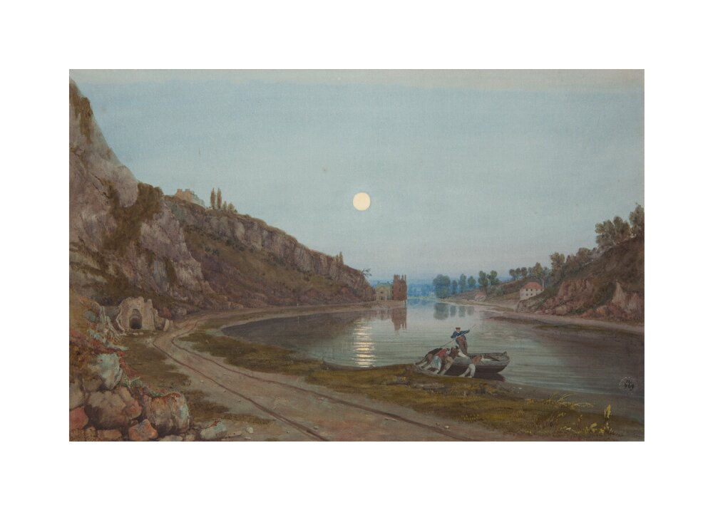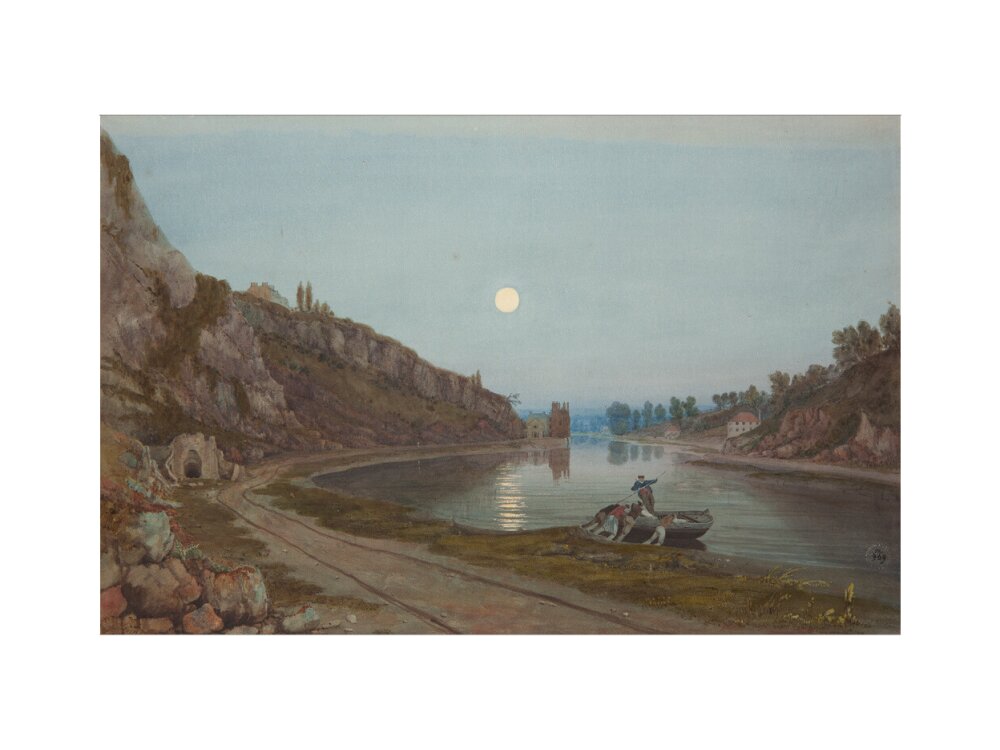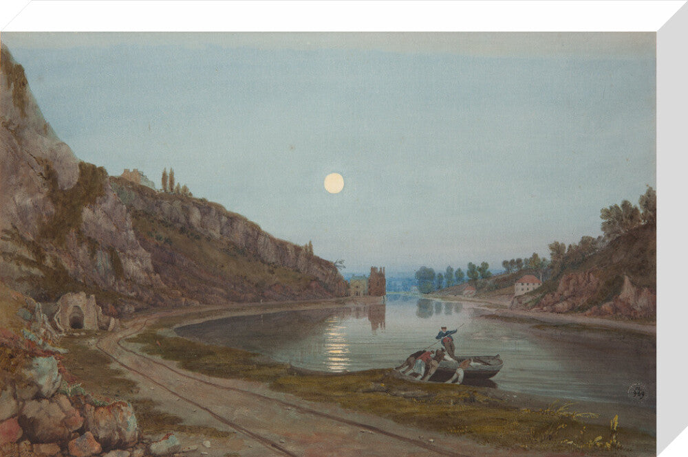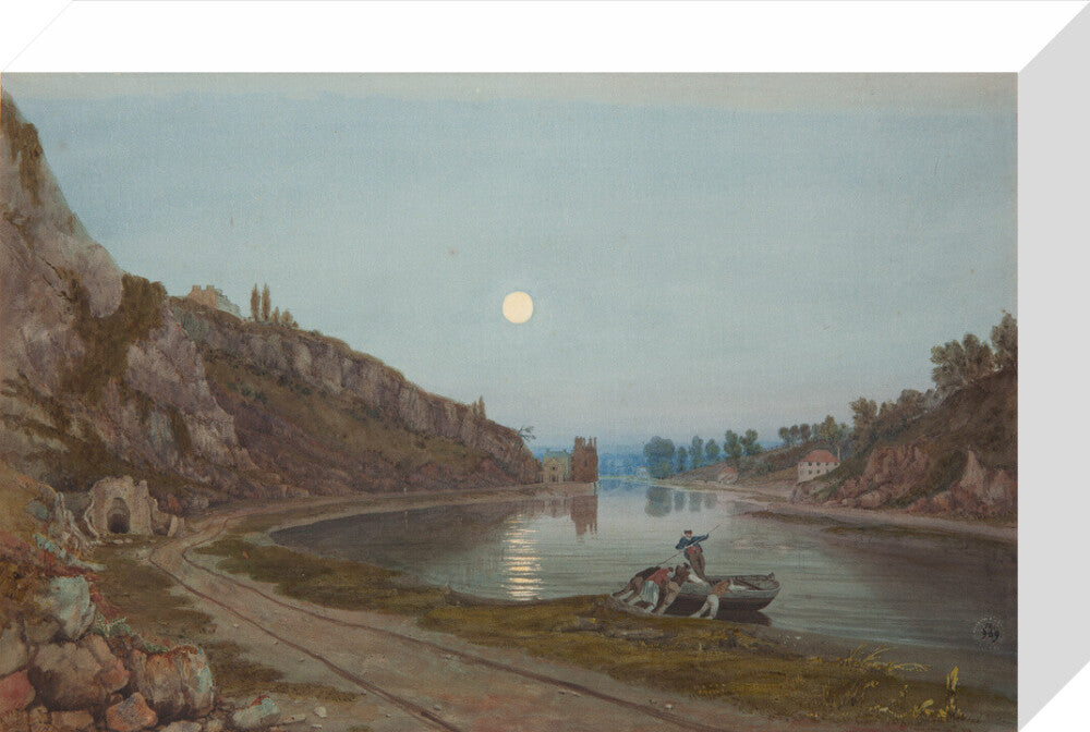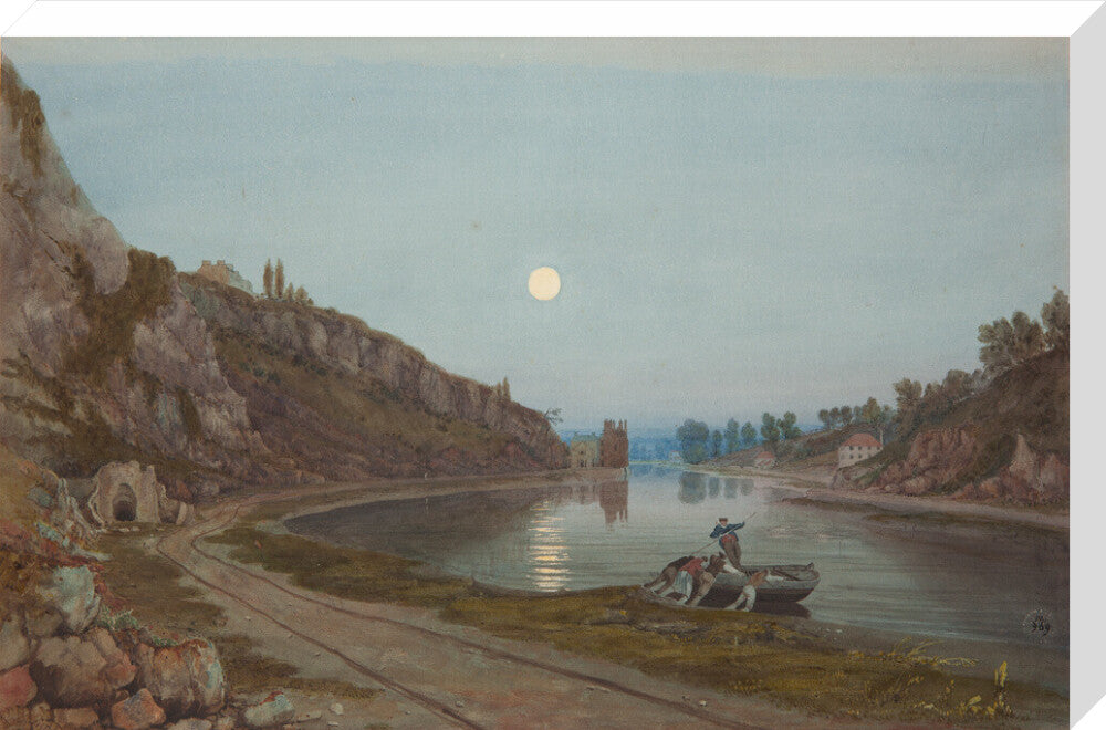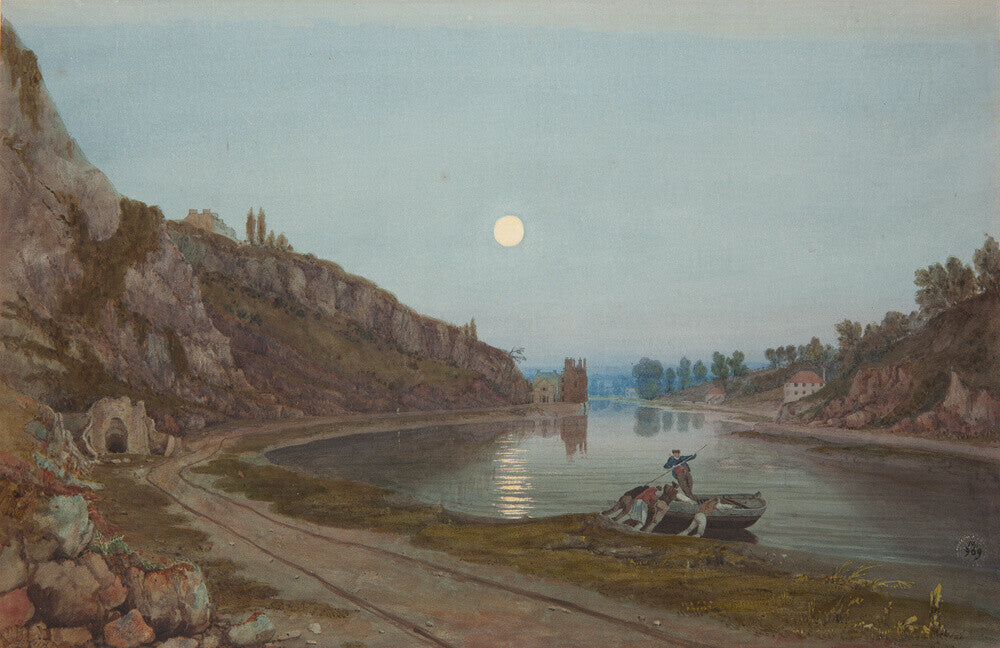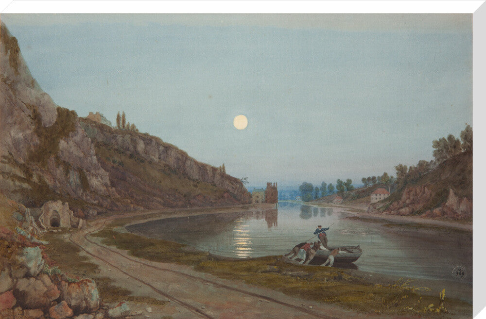 A twilight view from the shore of the river in the Avon gorge. In the foreground four men push out a small wooden boat with one man riding in the boat. The cliffs rise high on the left hand side and the moon is full and bright in the sky.