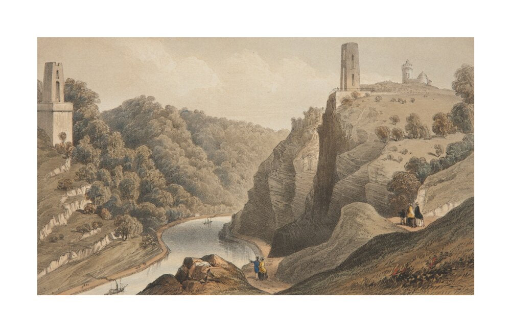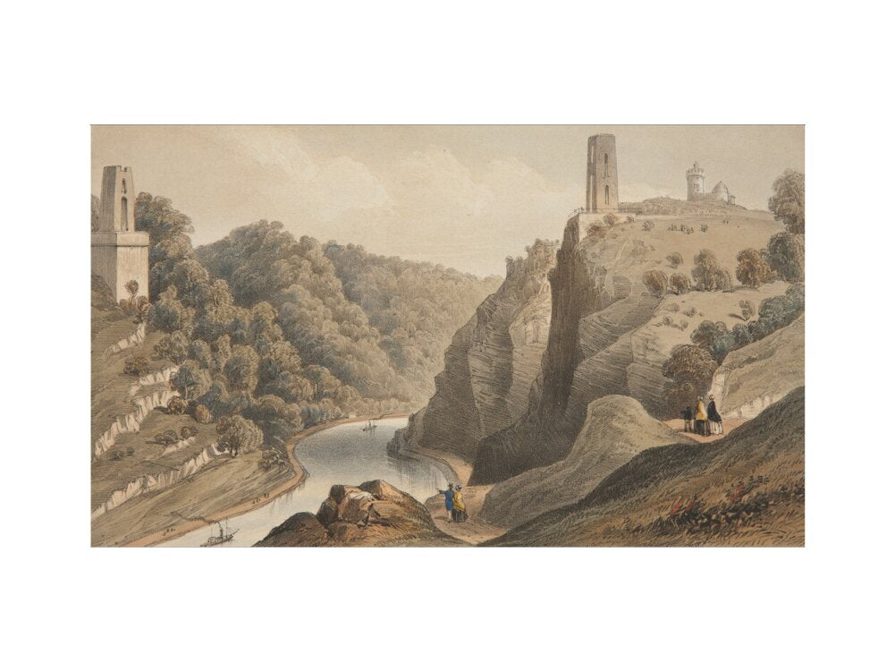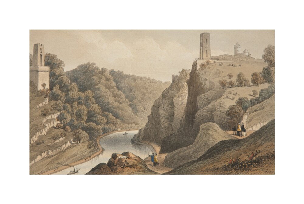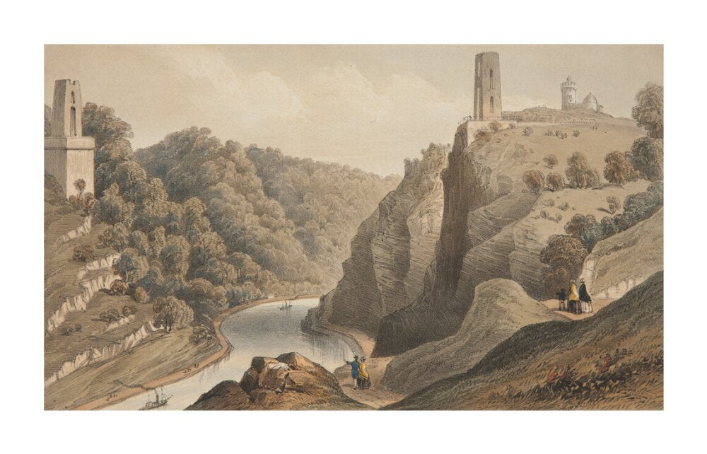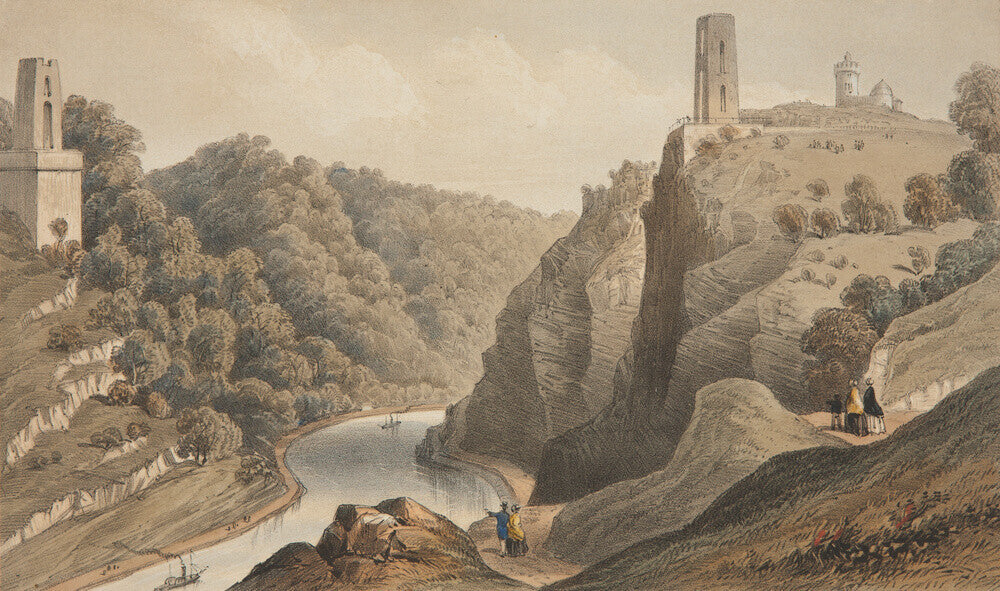 A view from the top of Avon Gorge on the Clifton side. The view plunges down into the valley below, with steep rocky cliff faces on each side covered in greenery. The cliffs on the left hand side are covered in thick woodland. On each side stands a turret of the suspensions bridge, but the bridge itself hasn't been built yet. Behind the turret on the left hand side stands Clifton Observatory. Figures on the left hand side point and look out at the view.