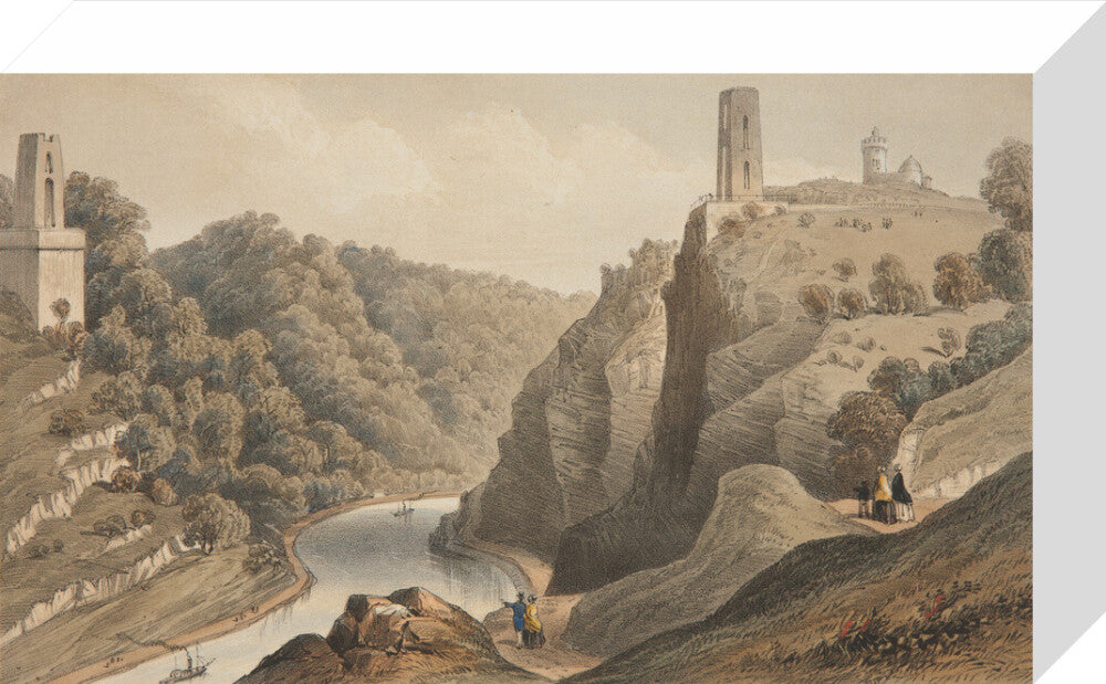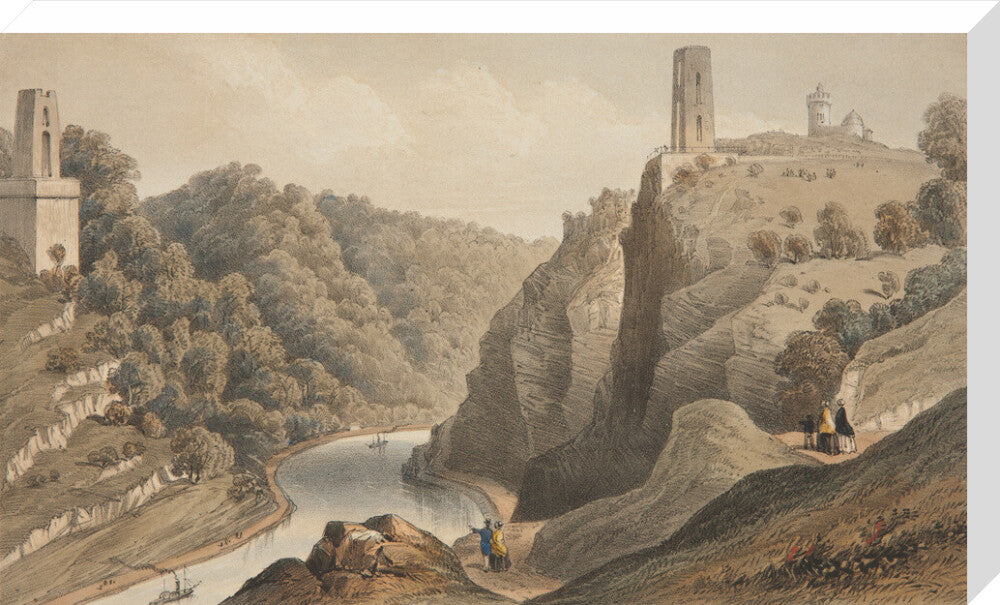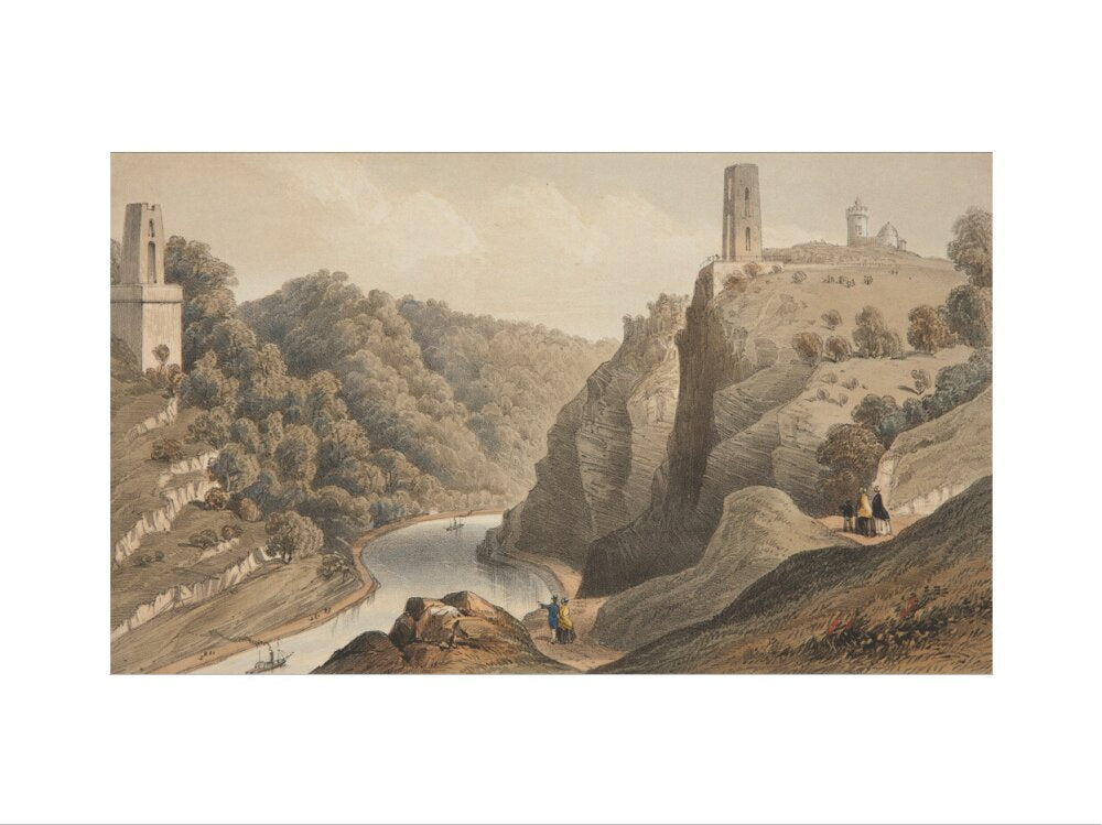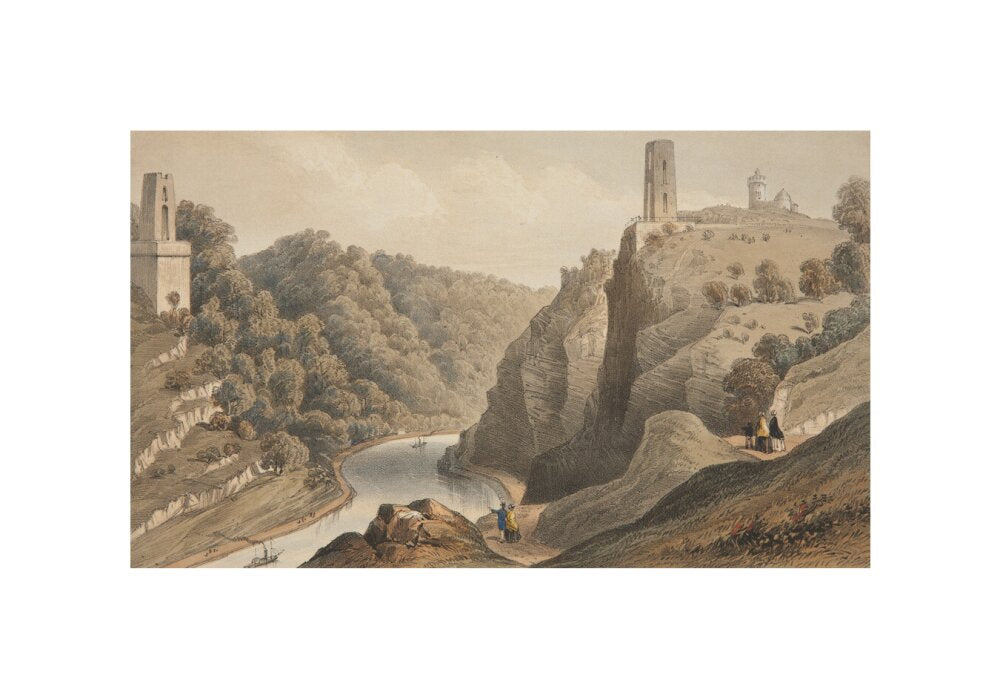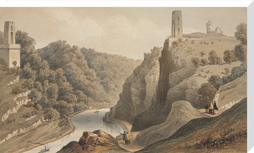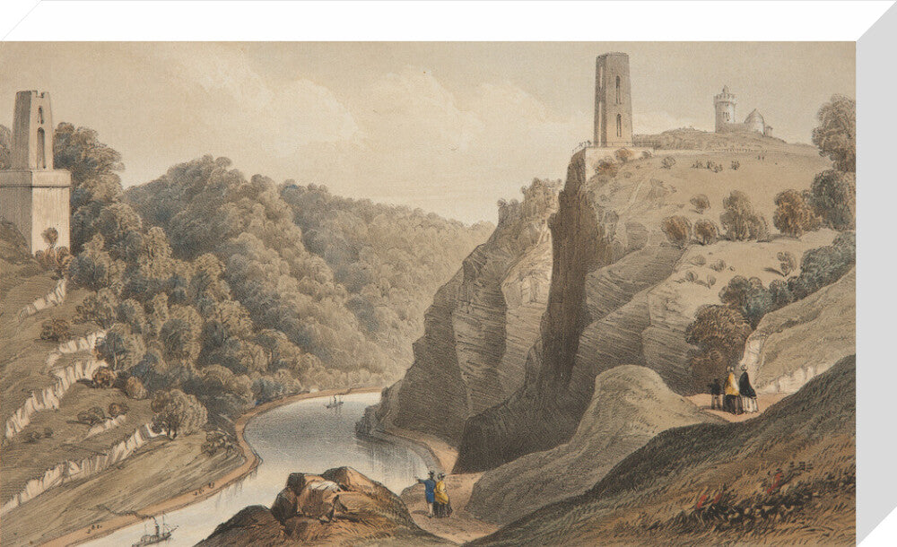 A view from the top of Avon Gorge on the Clifton side. The view plunges down into the valley below, with steep rocky cliff faces on each side covered in greenery. The cliffs on the left hand side are covered in thick woodland. On each side stands a turret of the suspensions bridge, but the bridge itself hasn't been built yet. Behind the turret on the left hand side stands Clifton Observatory. Figures on the left hand side point and look out at the view.