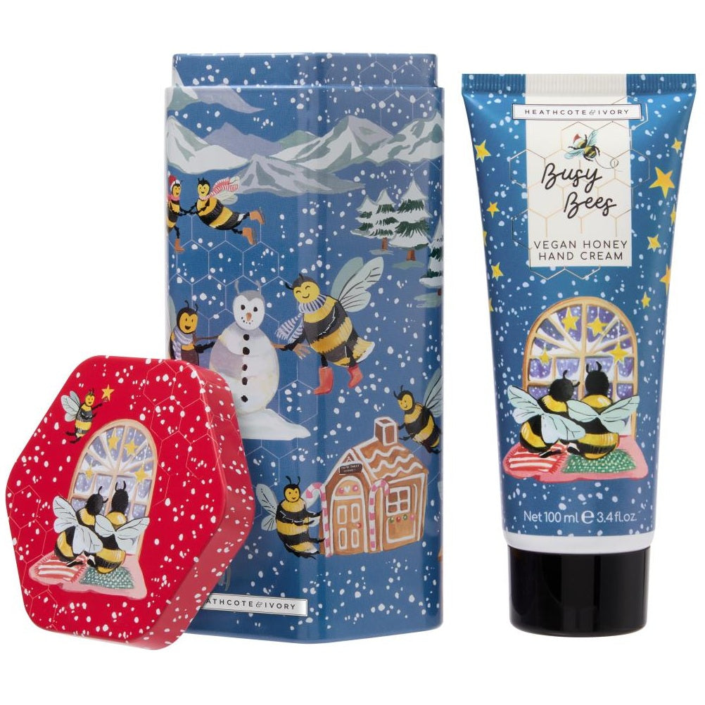 A cheering snowman and buzzing bumblebees tin containing Thyme & Honey hand cream. There may be honey in the name, but the fragrance is honey-free ensuring this hand cream with shea butter is 100% vegan.