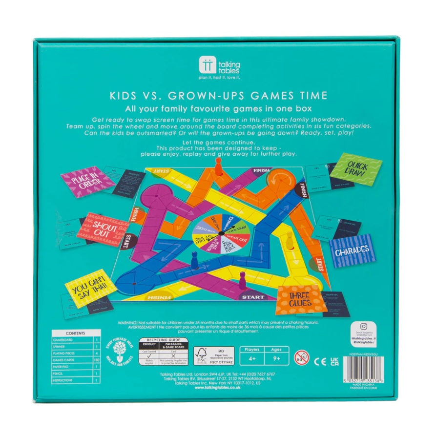 You can't choose your family but you can choose your teammates! Team up with a mixture of adults and kids in each team or go head-to-head as kids vs grown ups for the ultimate games night showdown. Players must spin the wheel to select a game and win the round to move their playing piece around the gameboard. With 6 games to land on including Charades, Quick Draw and Three Clues - there's a game to match everyone strengths, as you dance, draw and sing your way to the finish line.